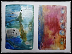 Took a piece of water colour paper, sprayed it with water and added shavings from Inktense Blocks in blues and greens which i moved around with my fingers. Made the marks with the bottom of a paint brush.